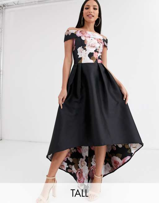 Chi Chi London Tall Printed High Low Bardot Dress In Black Floral Print Asos